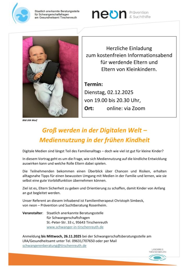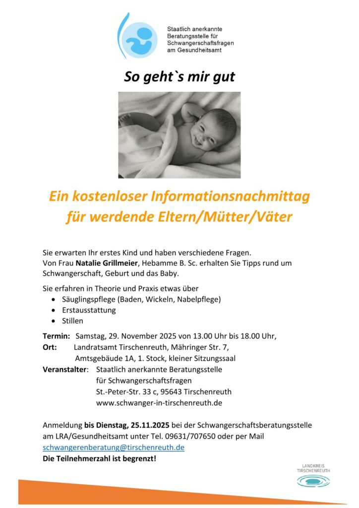 die staatlich anerkannte Beratungsstelle für Schwangerschaftsfragen am LRA – Gesundheitsamt Tirschenreuth lädt werdende und junge Mütter/Väter/Eltern zu zwei interessanten Veranstaltungen ein: