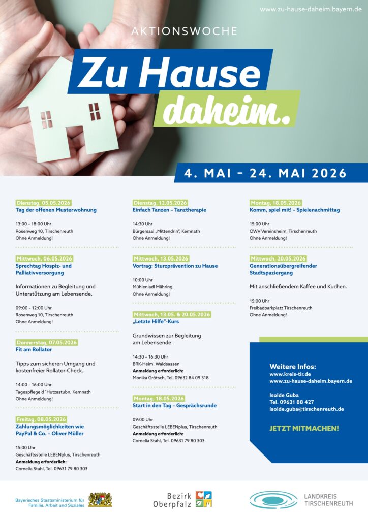 Der Landkreis Tirschenreuth beteiligt sich an den bayernweiten Aktionswochen „Zu Hause daheim“, die in diesem Jahr vom 4. bis 24. Mai 2026 bereits zum sechsten Mal stattfinden. Auf Initiative des Bayerischen Staatsministeriums für Familie, Arbeit und Soziales werden dabei in ganz Bayern Veranstaltungen rund um ein selbstbestimmtes Wohnen und Leben im Alter angeboten. Ziel ist es, aufzuzeigen, wie Menschen möglichst lange sicher, selbstständig und gut unterstützt in den eigenen vier Wänden leben können.